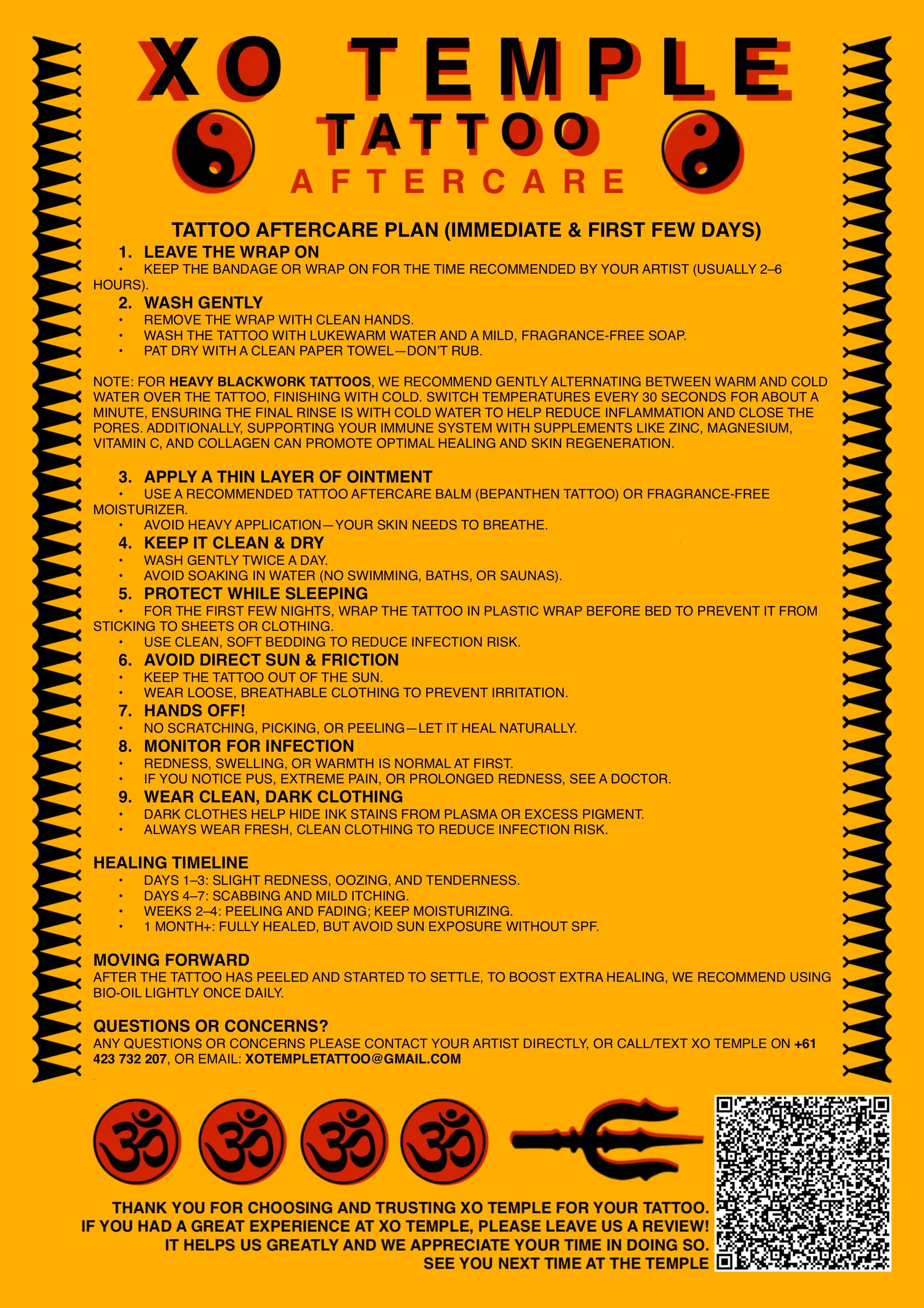 Any questions or concerns please contact your artist directly, or call/text XO Temple on +61423732207, or email: XOTempleTattoo@gmail.com